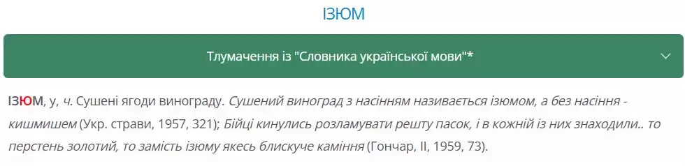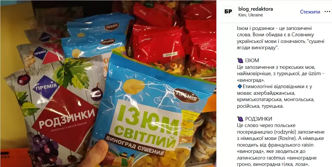 "Ізюм і родзинки – це запозичені слова. Ізюм – із тюркських мов, найімовірніше, з турецької, де üzüm – "виноград", а родзинки – через польське посередництво (rodzynki) запозичене з німецької мови (Rosíne)", – пише вона і додає, що німецьке походить від французького raisin "виноград", яке зводиться до латинського racēmus і означає "виноградне гроно, виноградна гілка, лоза".