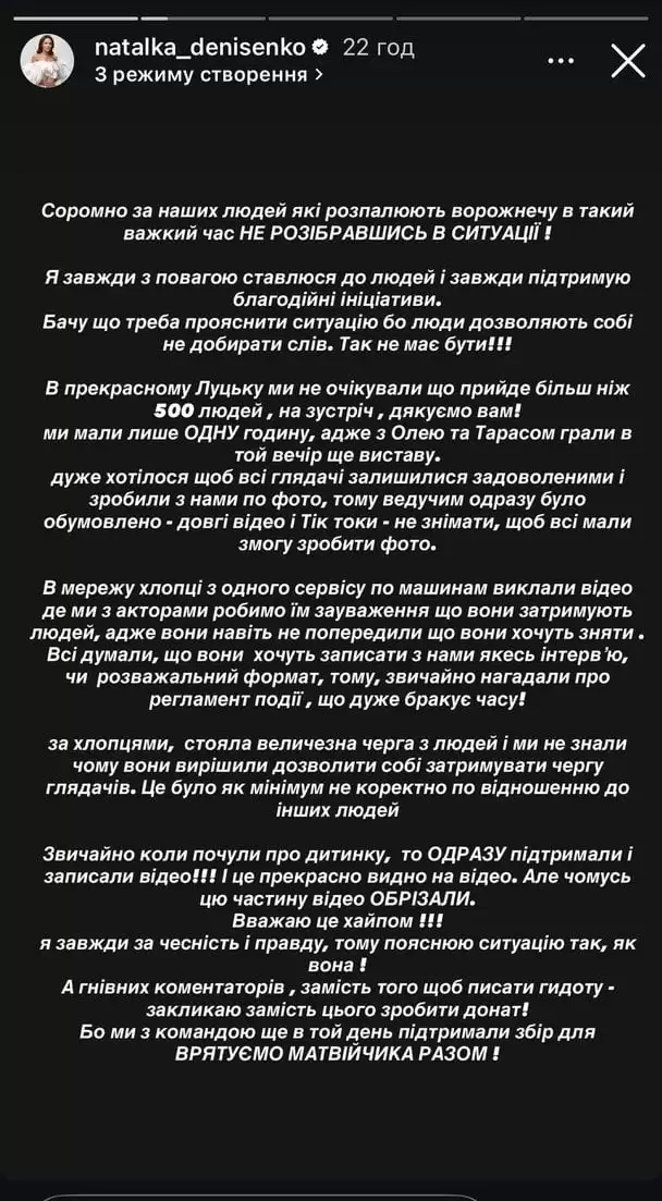 «В Мережу хлопці з одного автосервісу виклали відео, де ми з акторами робимо їм зауваження, що вони затримують людей, адже вони навіть не попередили, що хочуть зняти. Всі думали, що вони хочуть записати з нами якесь інтервʼю чи розважальний формат, тому, звичайно, нагадали про регламент події, що дуже бракує часу! За хлопцями стояла величезна черга з людей і ми не знали, чому вони вирішили дозволити собі затримувати чергу глядачів. Звичайно, коли почули про дитинку, то одразу підтримали і записали відео!» — йдеться у заяві Денисенко.