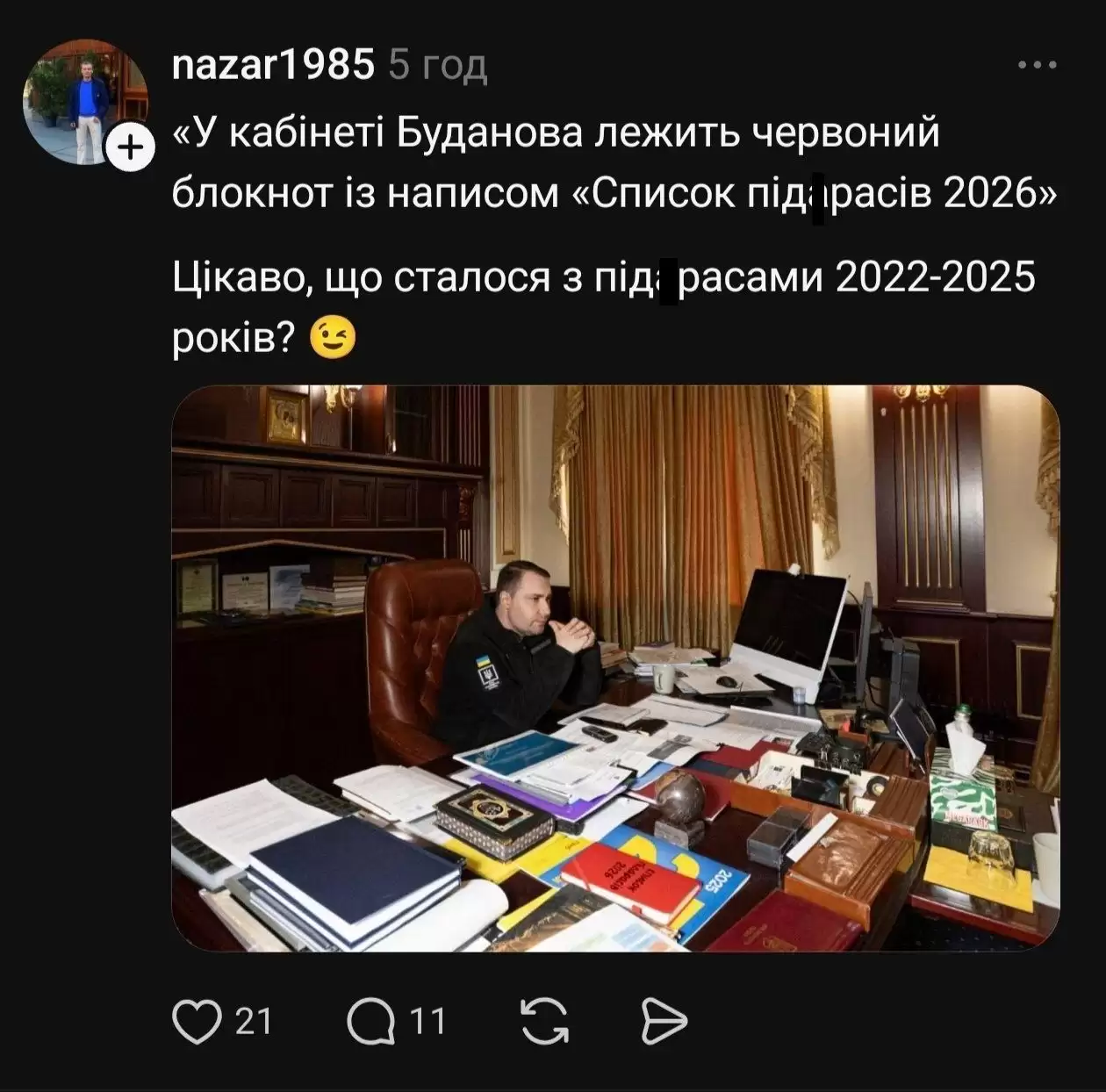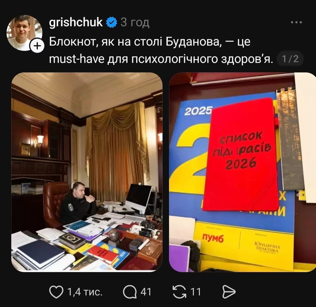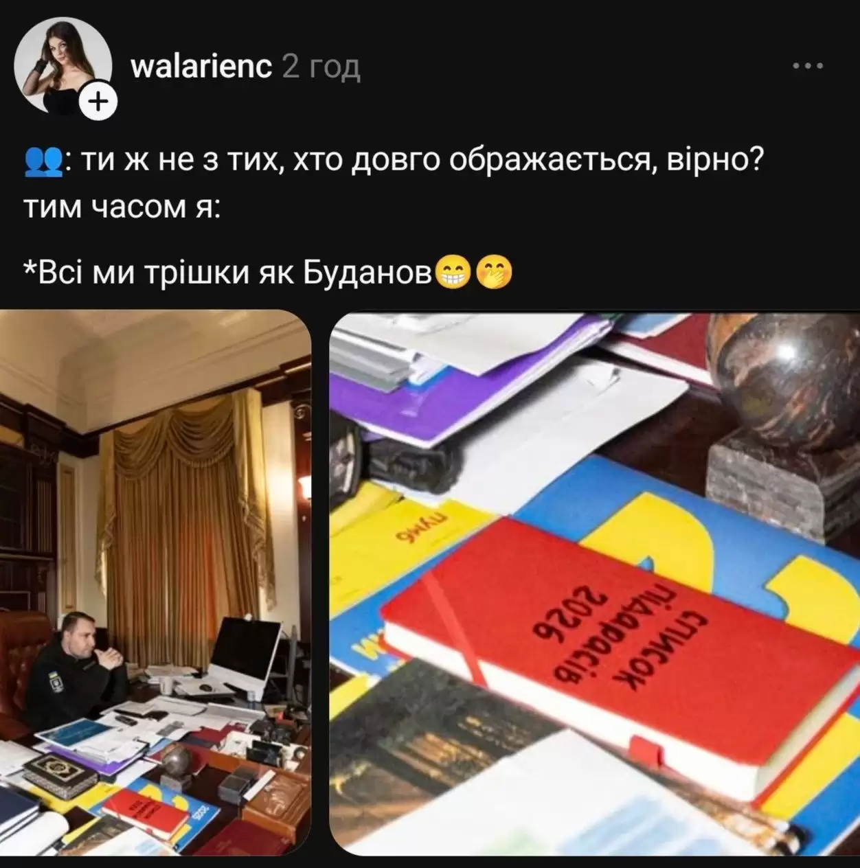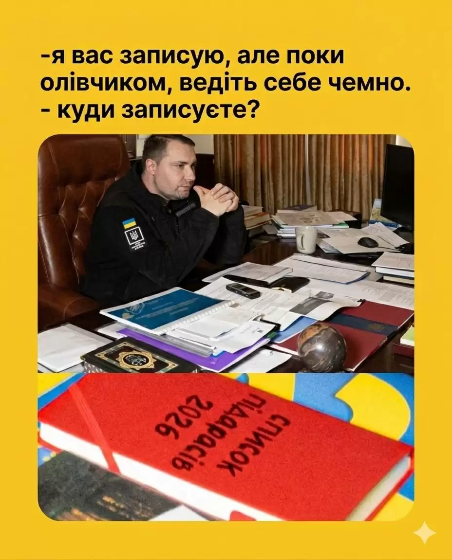 Окрім великої шахівниці та ікони над головою Кирила, на його робочому столі виділяється червоний блокнот. На фото можна роздивитися смішний напис: "Список під***сів 2026". Саме цей оригінальний блокнот і спровокував нову хвилю мемів про Буданова.