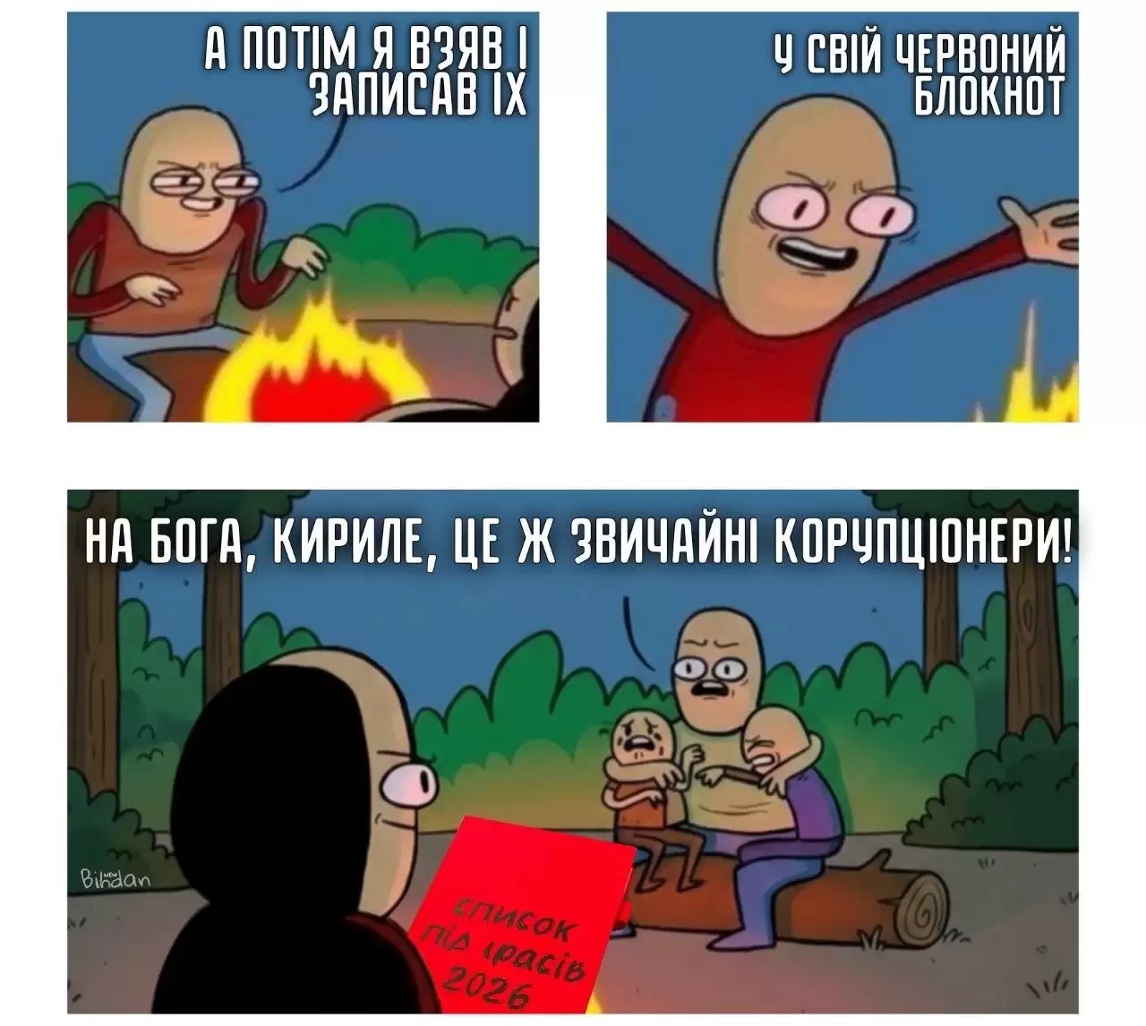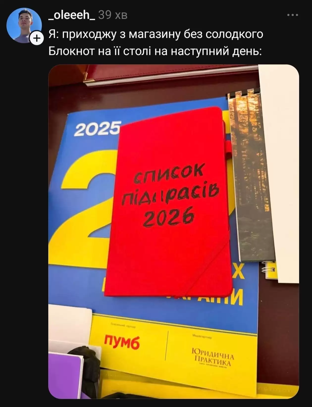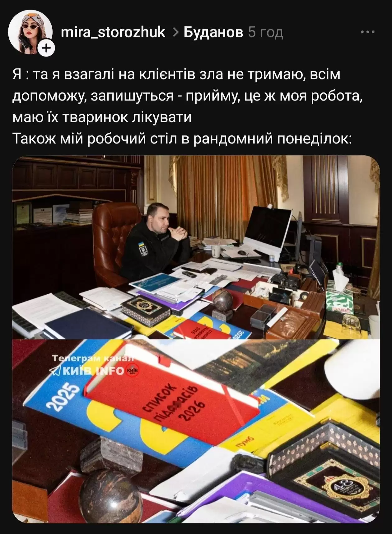 Окрім великої шахівниці та ікони над головою Кирила, на його робочому столі виділяється червоний блокнот. На фото можна роздивитися смішний напис: "Список під***сів 2026". Саме цей оригінальний блокнот і спровокував нову хвилю мемів про Буданова.
